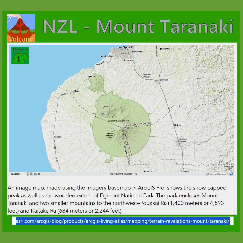 Terrain Revelations—Mount Taranaki By Aileen Buckley, PhD, Esri Research Cartographer “Around 1755, an eruption sent a pyroclastic flow down the mountain’s northeast flanks. Its most recent volcanic activity, in the 1850s or 1860s, produced a lava dome in the crater that then collapsed down the side of the mountain.”