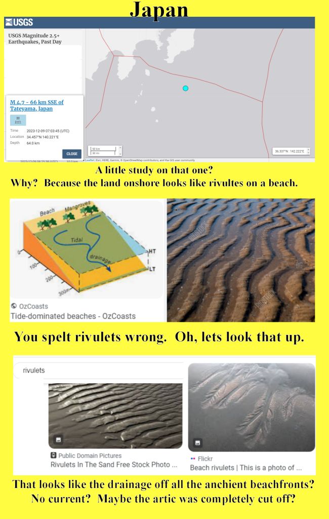 1330pm 09 December 2023 Japan, you have to realise that very few people take as Holistic a view of the world as we do? The artic completely cut off? And possibly the Antarctic too, there’s only a short distance between Patagonia and the place? It’s an explanation for the tall steep sides on North and South America? The entire coastline battered by huge waves? The ocean piling up it’s energy on the mountains? No currents in the Atlantic? And? And suddenly there’s a breach and there’s currents and heat movements? The Ocean moving the sun’s heat to a different pattern? And? And the ice starts to melt? Though it’s a bit like a spring and it get’s hotter and colder and hotter? It’s a big theory? Well, it’s only a small planet? Let’s call it that, The Small Planet Ice Breach theory? Lara, tell some of them this and they’re going to wish they were wearing ice britches. Jodhpurs, I wear jodhpurs not britches. Well, put your jodhpurs on and go tell that big friend of yours? They’ve probably heard the theory before, though a long time ago. That from one of the library books? No, not that one.