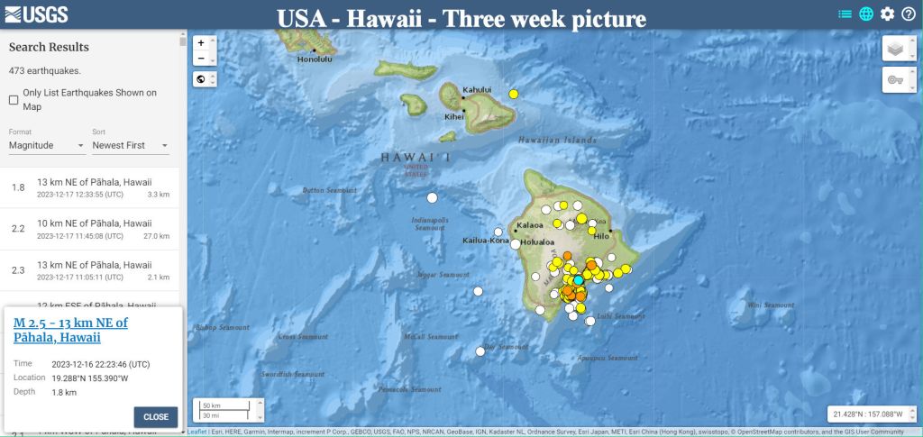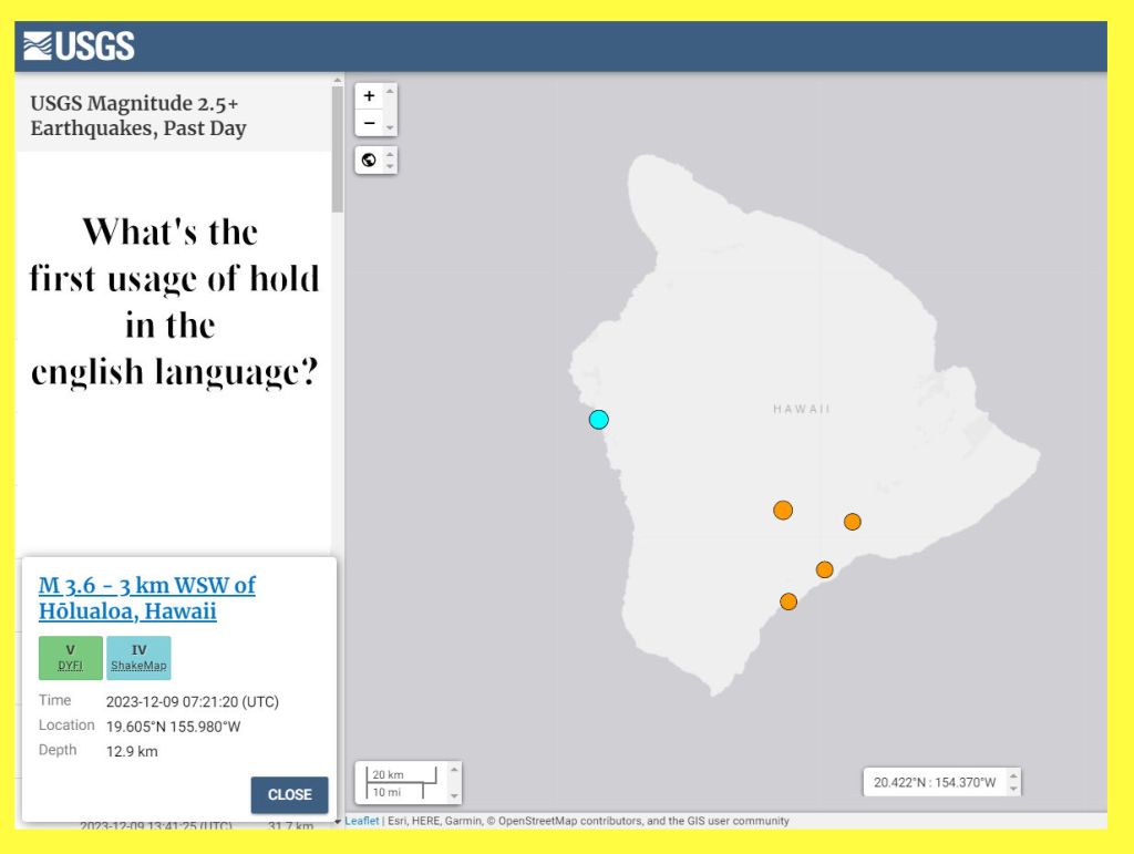 0500am 14 December 2023 USA Hawaii What’s unassigned mean? Oh, no one told us to watch it. The colours are supposed to be for lava flows? The gases produced by hot lava in salt water are??? The Circles are supposed to be for the earthquakes, the depth not mattering particularly as you’re a Volcano Observatory? However during the quiet times, it looked rather empty of colour and someone thought… Suggestions?