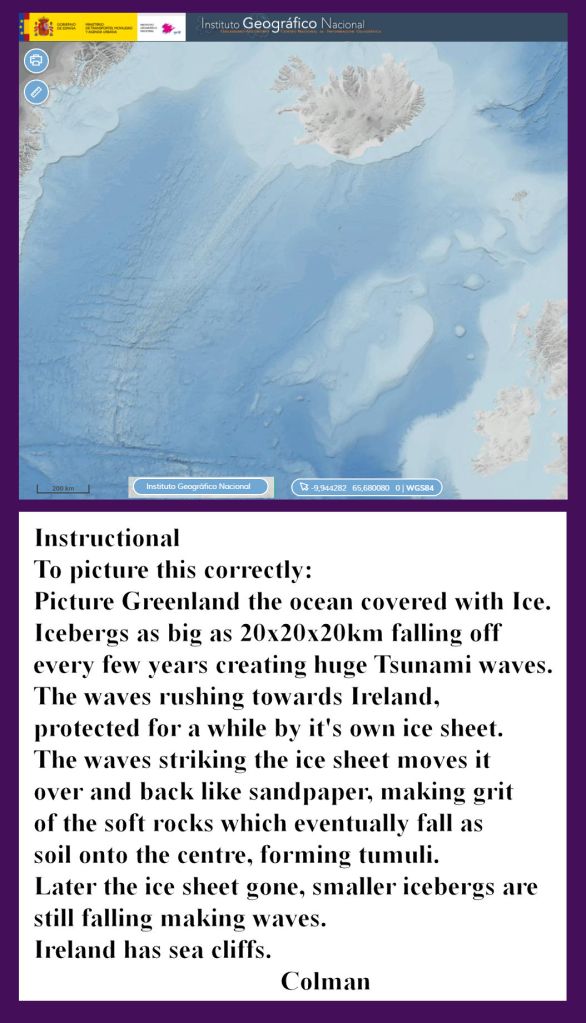 1020am 08 December 2023 Ireland – Well, if you look at the West coast of Ireland compared to the West coast of Morocco/Western Sahara or USA for that matter, Ireland has cliffs, tall cliffs. The oceans only been rising dramatically there for, the last what? 15,000 years, since the last ice age. The ocean hits the cliffs and the rock falls. No earthquakes and the cliff faces stay standing. Now, the other places, ocean hits the rocks, the rock falls and it gets split by earthquake seismic vibrations, wind, sunshine and suddenly you have sand, it happens quickly, so there isn’t time for it to become proper soil, it flows down a sandy river bed and into the ocean and more earthquakes and it forms a wide sloped feature. You know you’re actually describing a volcano in slow motion, without the hot sticky lava bits. Well, theoretically almost all the rock, including those of Ireland were originally lava etc. so you are quite right, it is a volcano in slow, slow motion, I might see if some old math works for that? Why do you talk about the water rising dramatically for Ireland, it’s everywhere? Well, there are some quite large inland water bodies, the water levels there, they go up and down too and though the time differences are in thousand or hundreds of thousand of years, it’s the same fluid theory, Great Lakes, Lake Baikal etc. You sound like you’ve been there? No, he has, we chat occasionally.