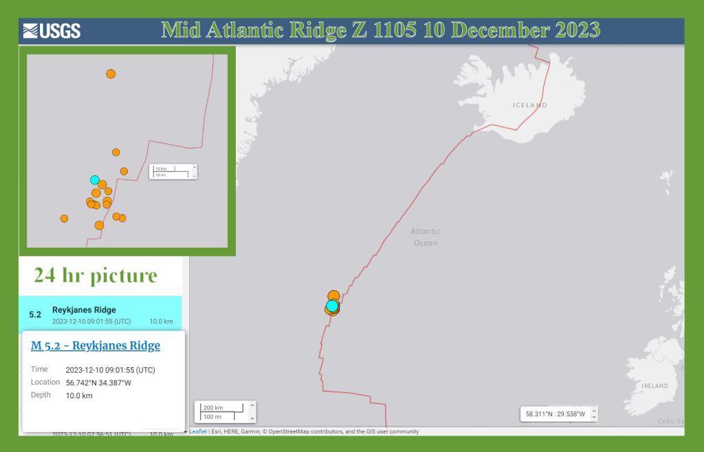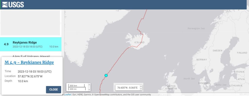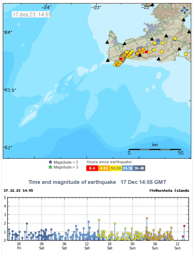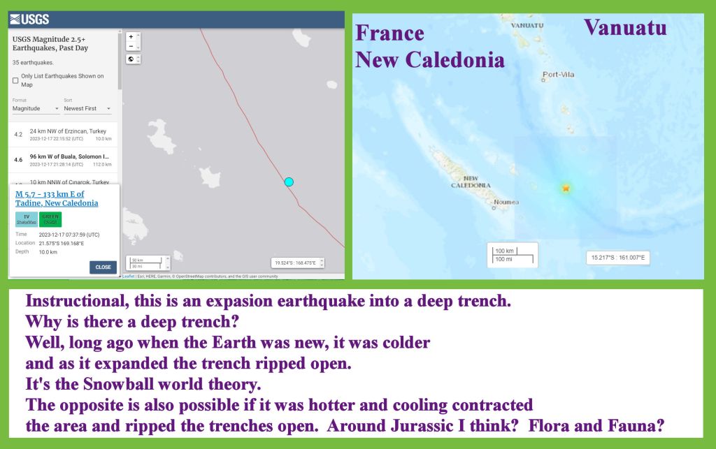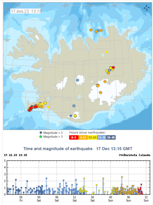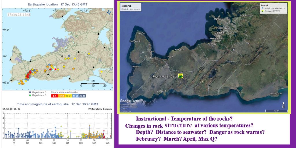 1320pm 17 December 2023 Iceland Why has the level of Earthquake dropped from M3.0 to M2.5 Well, I’d be guessing here, however, water freezes and the rocks are quite cold now, and the cold has dropped down quite deep, it’s almost Solstice, so I’d guess that the rocks containing water, having frozen are more brittle? Now the other possible explanation is the speed of movement, the contracting cooling rocks are being bent slower than earlier as the temperature cooling is slowed by the surrounding seawater and so, it’s like bending a bar of lead, you’re not looking at the top of the bar, you’re looking at the wrinkles forming on the inner curved surface. Bend it fast and you get big rips on top, bend it slowly and more of the energy becomes heat instead of micro fractures and the rips aren’t as deep. It’s the same for bending copper pipes etc.