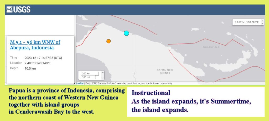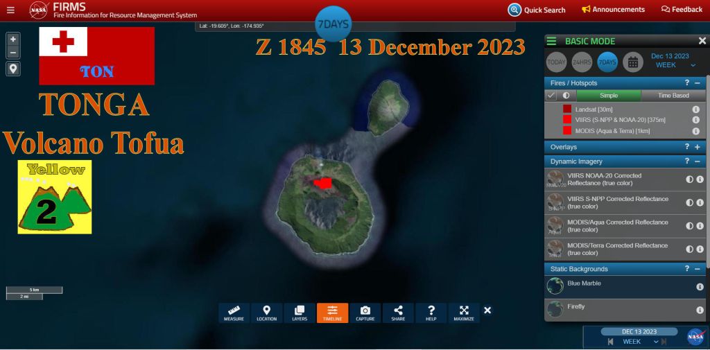 1850pm 13 December 2023 Tonga – What you looking at Tonga for? Summertime, everything warms up. And? Well water absorbs energy quite well, so it’s the ones near teh surface you have to watch. With a pointy top on them? Well, that just says they haven’t had an explosive eruption yet. The ones with pointy tops though, they do have more solid volume over the possible eruption site. True and the explosive potential needed to blow their top is much higher than one with a soft vent to the surface. Water does cool the things quite quickly though and there is sometimes a question about the plug sometimes being harder than the surrounding fast cooled lava and exploded remnants from the old eruptions surrounding the volcano peak or caldera? How would you predict the volcano? Well, the heating event might possibly have been at the front of the moving plate and an earthquake concurrent with the event might have happened long ago, so it’s quite difficult, though keeping a log of earthquake events from current data might possibly allow estimation of stored energy in the form of deep heated magma for future predictions?