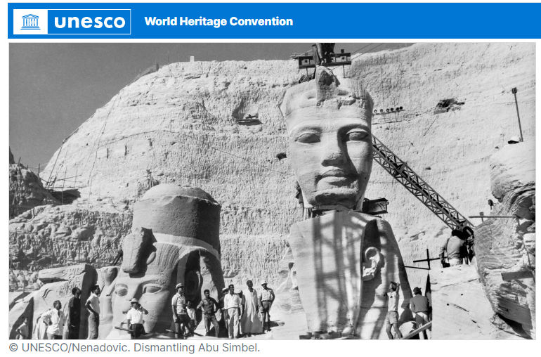 0720am 14 December 2023 World United Nations UNESCO ? Really? Why? Oh, he/she started the thing so we left it with them. https://whc.unesco.org/en/story-abu-simbel/ The moved Abu Simbel to save the monument from the rising waters due to the Nasser dam in ??? ”From 1960 to 1980, UNESCO orchestrated the gigantic project. Archaeological research in the flood areas was intensified, yielding exciting new discoveries. In all, 22 monuments and complexes were saved by 40 technical missions from five continents. Massive temples, notably those of Abu Simbel and Philae, were relocated. Total cost came to US$80 million, half of which was donated by some 50 countries.” ”Abu Simbel was inaugurated in its new location on 22 September 1968. The Philae monuments, the last to be saved, were transported to the higher Agilkia island between 1972 and 1979.” I visited Abu Simbel at it’s new location. It’s quite impressive, they did an amazing job concealing the tiny cracks, where the saws cut the mountainside. More than 1000 blocks most over 30 tonnes each. Ah, here it is ”The key was international solidarity. UNESCO convened top experts – hydrologists, engineers, archaeologists, architects – who devised a radical plan: temples would be dismantled, moved to higher ground and reassembled.”