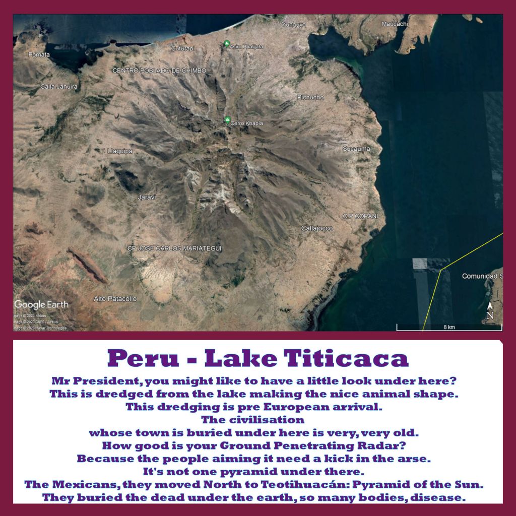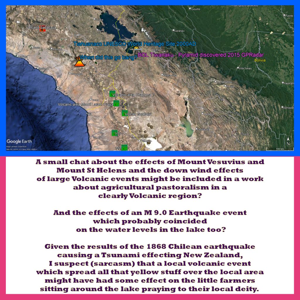0355am 14 December 2023 Peru Nice thesis, a little look at Google Earth might be a thought? ”Regionally, Inca shrines replace LIPchullpa cemeteries as principal ceremonial loci. Inca shrines near pre-Inca sacrosanct sites, and the evidence for their construction and use “by local actors,” indicate a “mutual accommodation between Inca and local religious traditions”; in contrast, shrines on the Island of the Sun emphasize “tight control” and an Inca-dominated hierarchy (Arkush 2005: 239 – 340).” Ruralism, land use history, and Holocene climate in the Suches Highlands, Southern Peru by Benjamin Vining 2012 Colman’s comment There’s a few volcanoes. Now some people would ask, why the yellow stuff on top of mountain? Actually the mountains are so high that the rain doesn’t fall up there, the clouds are normally under that level. It’s a troposphere thing. Ask a weather expert. In Volcano terms they’re so tall that it means that if it blows, it blows, really, really big. ”When the wind blows” style, without the radioactive fallout, though I’d do a Geiger counter check too, just in case?