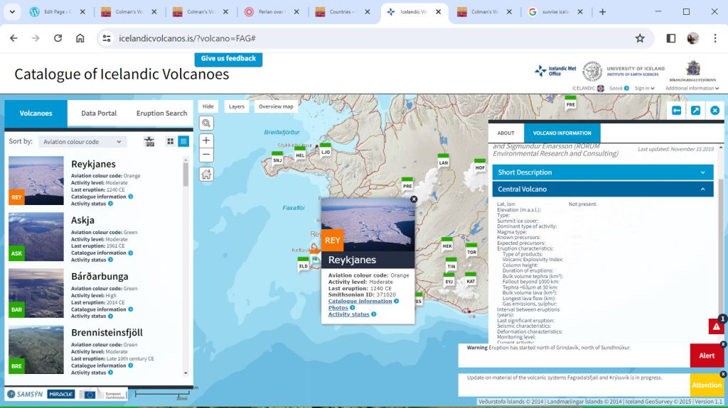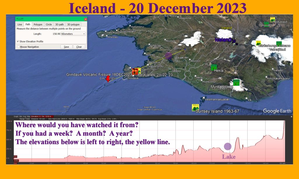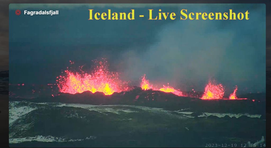 UK SkyNews – Volcano erupts in Iceland after thousands evacuated from town Lava has been emerging from a crack in the earth’s surface which was around 3.5km ( 2 miles) long and had grown rapidly, the Icelandic Meteorological Office said. Tuesday 19 December 2023 03:29, UK