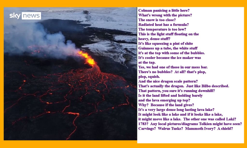 1235pm 20 December 2023 Iceland Sky News Iceland volcano – latest: Fresh spectacular pictures; warning volcanic eruption could last ‘for months’ Wednesday 20 December 2023 11:52, UK Where were they looking at if they saw this at Laki? Another much earlier volcano site? With a viewing mountain nearby? With clear skies? Summer… No. Night, it was at night just like this one. Since the eruption sites here have been moving to the South West, bit, by bit over many years, Is this a mirror of an earlier version? it’s annoying to say it, however? that the other dragons left wing above right and is there a story about two dragons vying over the one treasure? Seen from up over there at the back etc. The cameraman seems to be conveying his version of events too? Old knowledge?