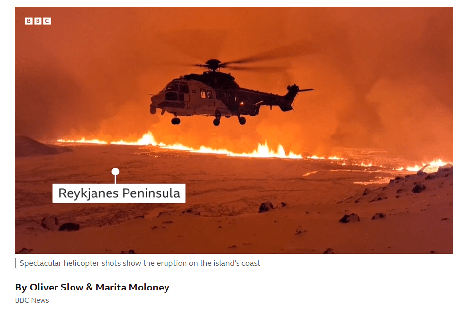 1200pm 20 December 2023 Iceland UK BBC – Iceland volcano: Pollution warning for capital after eruption Published 2 hours ago By Sofia Bettiza, Oliver Slow and Marita Moloney ”Fumes could reach Reykjavik by Tuesday evening or Wednesday morning.” Someone didn’t have their cornflakes this morning? BBC News, Iceland and London